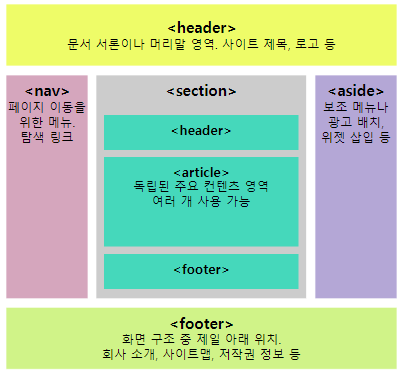 HTML5 웹 표준 : 각 영역을 구분하는 구조적 태그를 정의하여 사용.