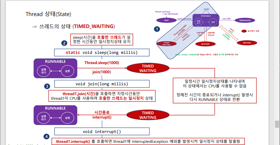 └어떤 스레드가 진행 중일 때 나머지 스레드의 상태를 확인하는 것.