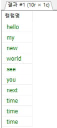 SUBSTRING_INDEX (SUBSTRING_INDEX('hello,my,new,world,see,you,next,time', ',', numbers.n),',',-1) AS 컬럼명