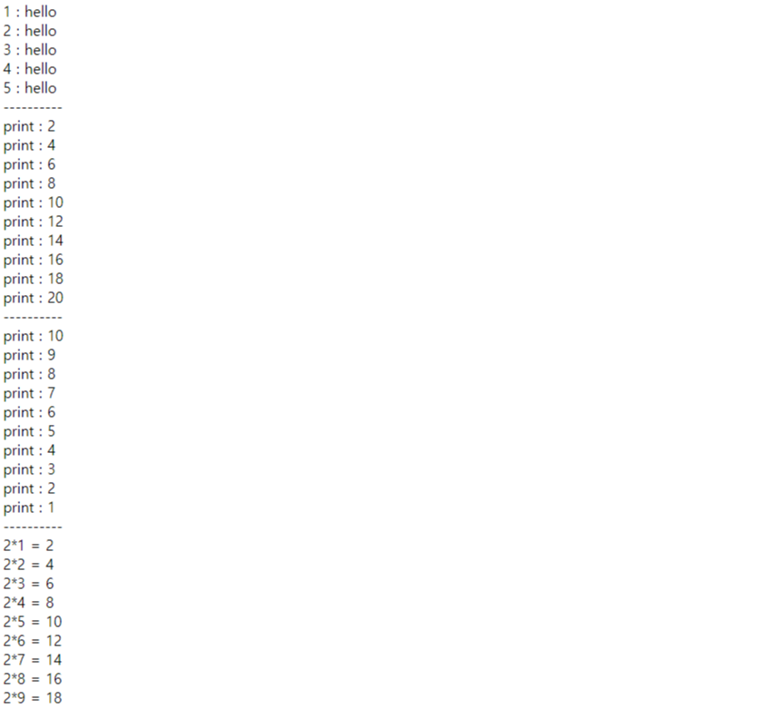 | 초기식 실행 | → 조건식이 참이면, 실행문 실행 | → 증감식 |